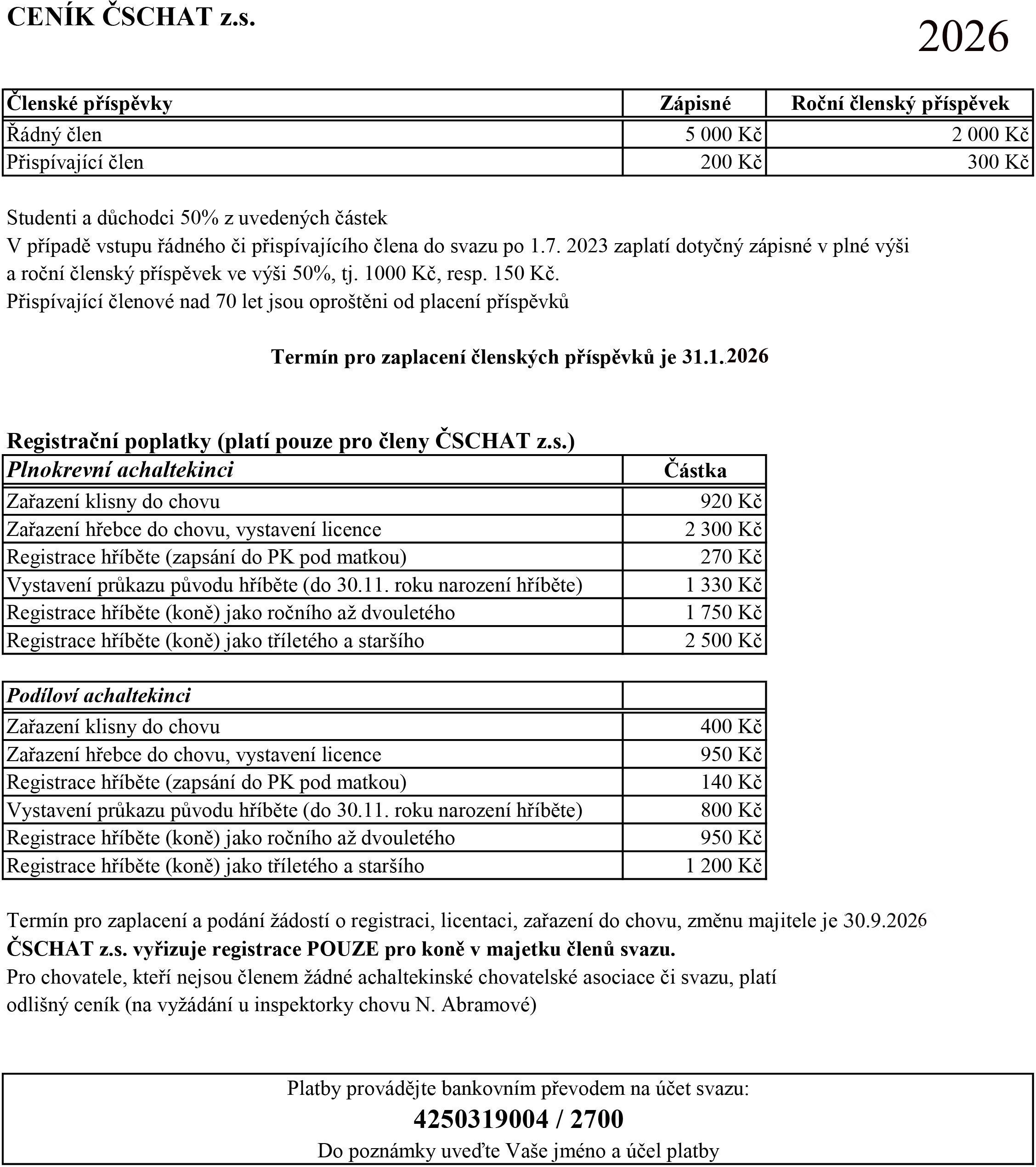 příslušného poplatku (viz Ceník ČSCHAT z.s. – do